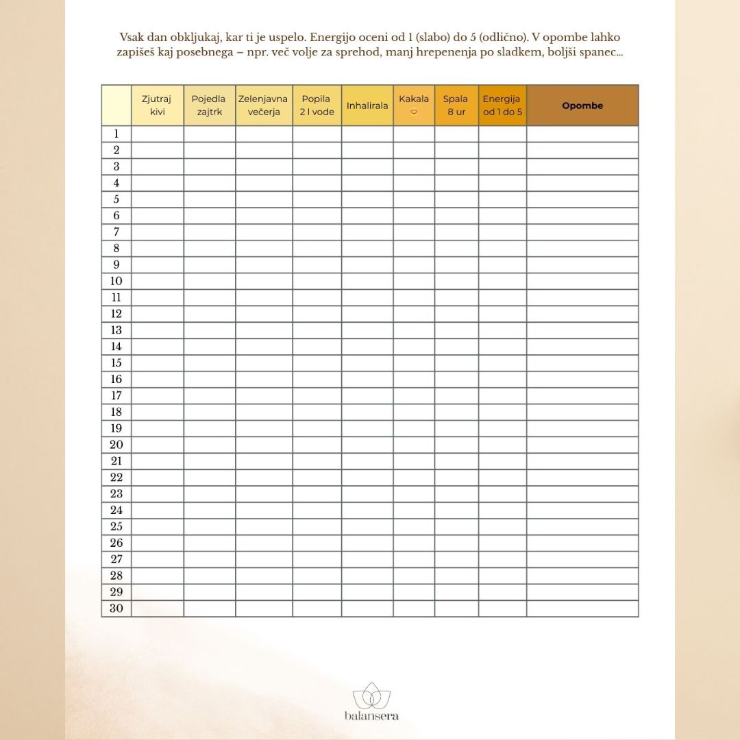 📊 Tabela za spremljanje doslednosti in napredka – da ostaneš motivirana tudi, ko pridejo težji dnevi.